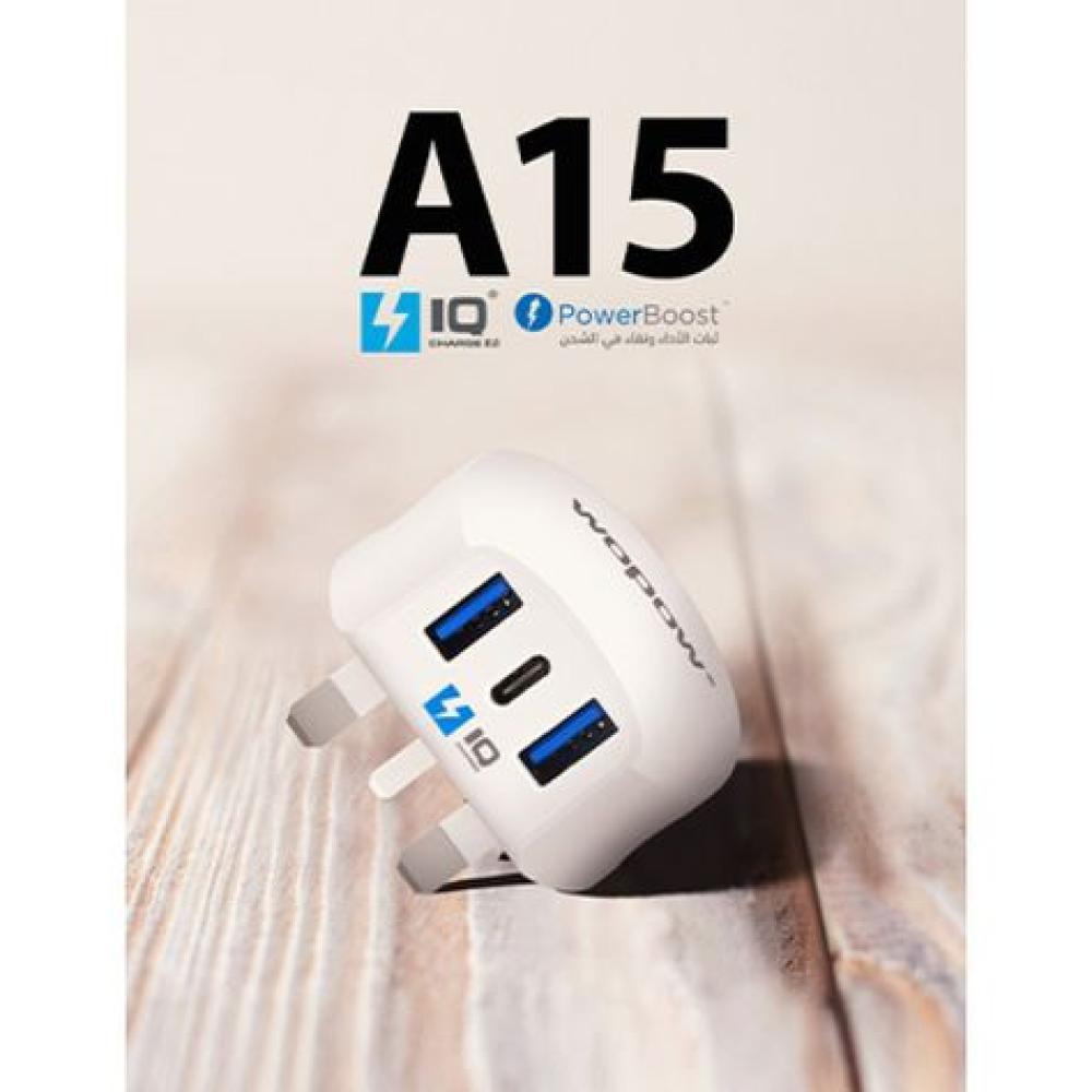 شاحن جداري A15 باللون الأبيض بمنفذين USB-A ومنفذ Type-C. يدعم تقنية الـ IQ وتقنية الـ Power Boost.بقوة 17 واط.منفذ التايب سي لايدعم شحن اجهزة ابل الحديثة ( ساعة ، ايباد ، اي...